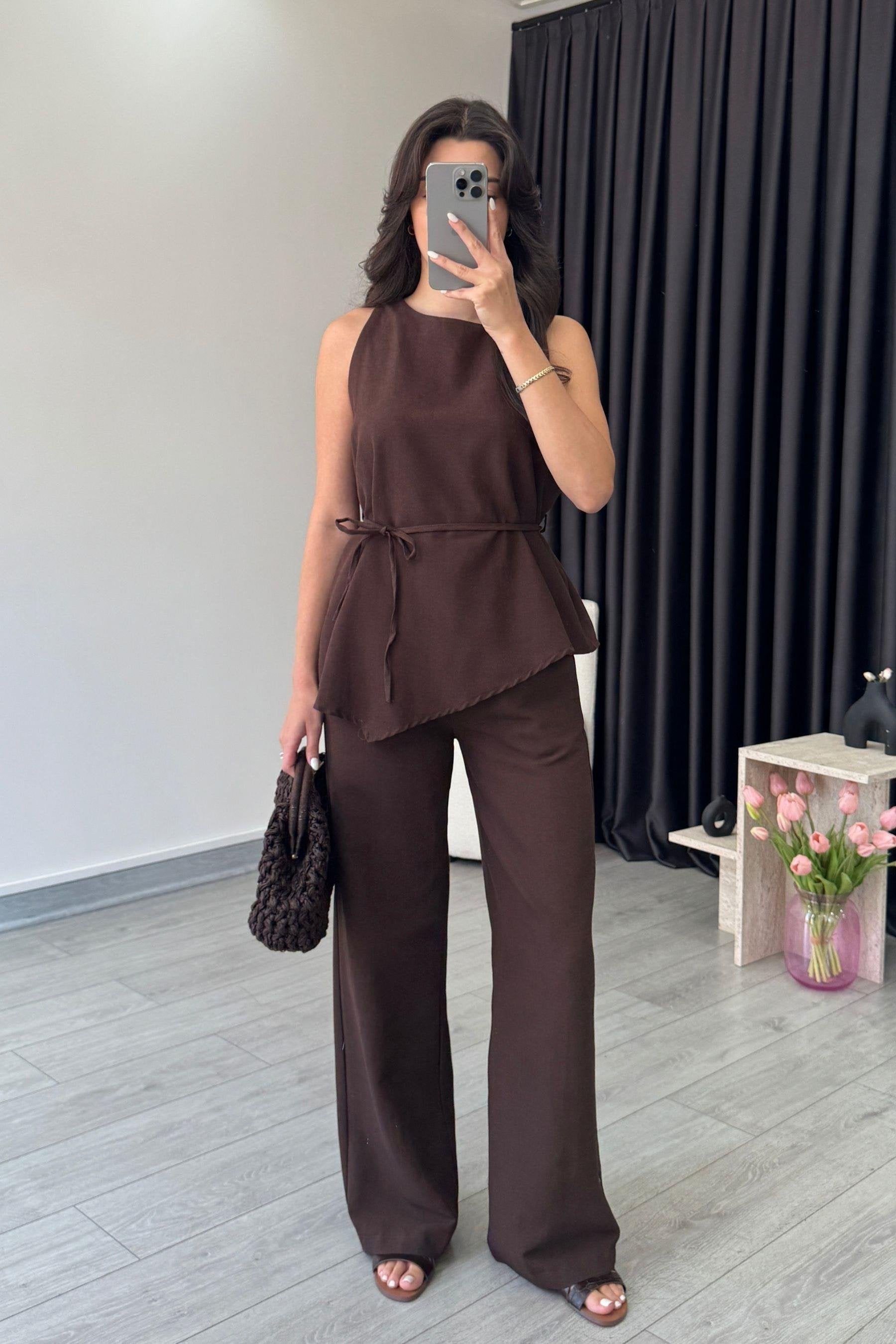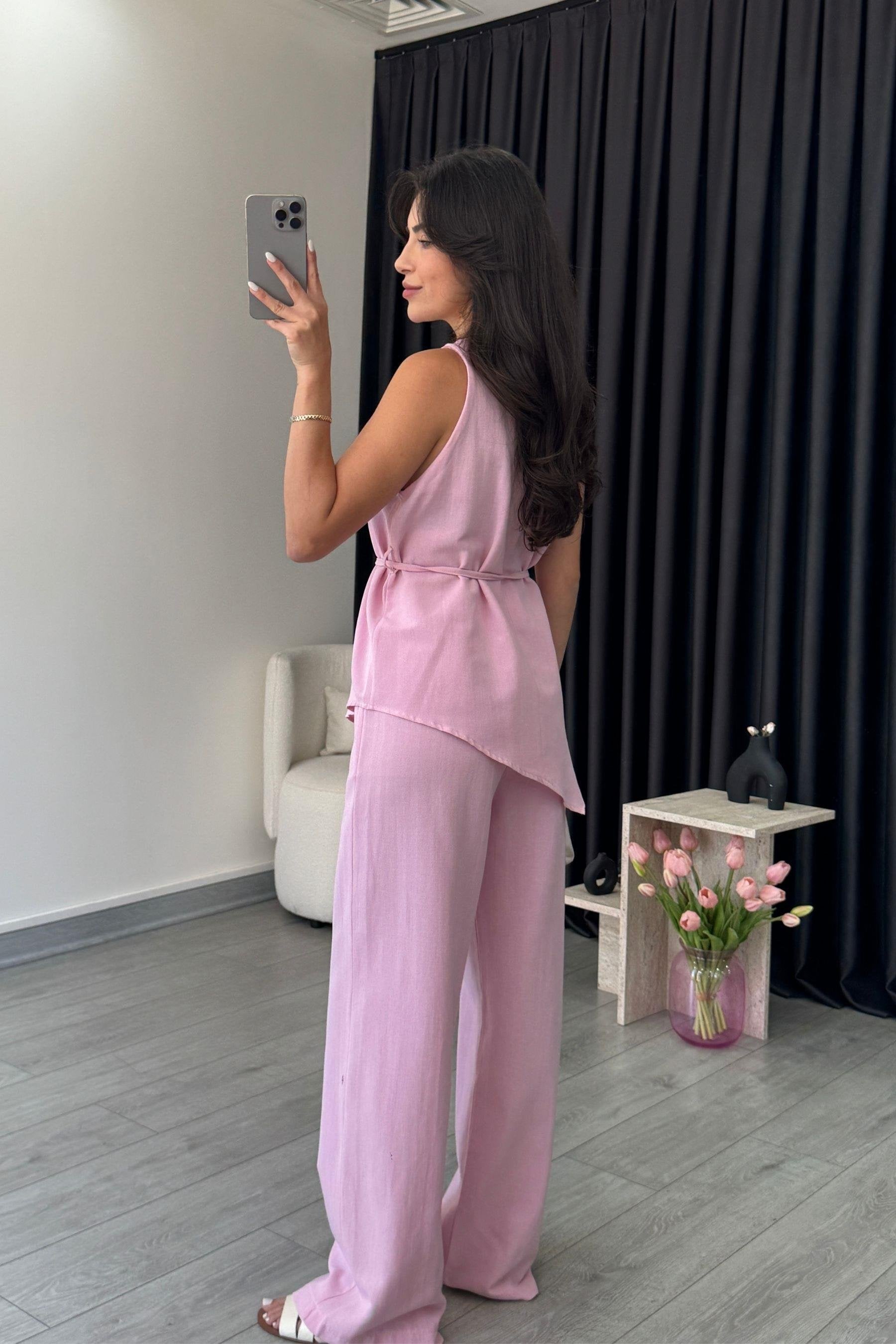 Meet the Amara Co-ord Set from Sui Doora – a contemporary blend of clean tailoring and relaxed charm made of Premium Quality of Cotton. The sleeveless top is designed with a soft round neckline and a unique asymmetrical hemline, featuring a delicate waist tie for a flattering silhouette. Paired with coordinated wide-leg pants, this ensemble offers ease without compromising on style.