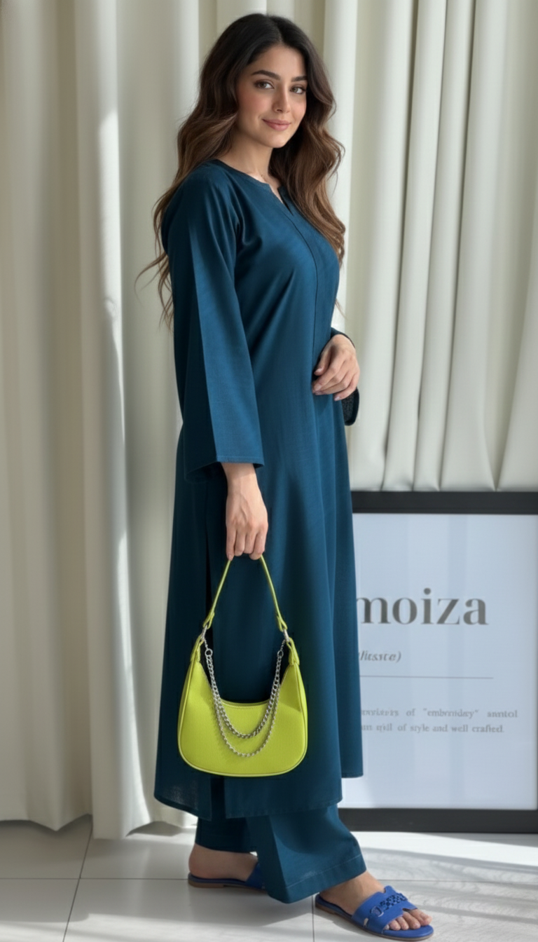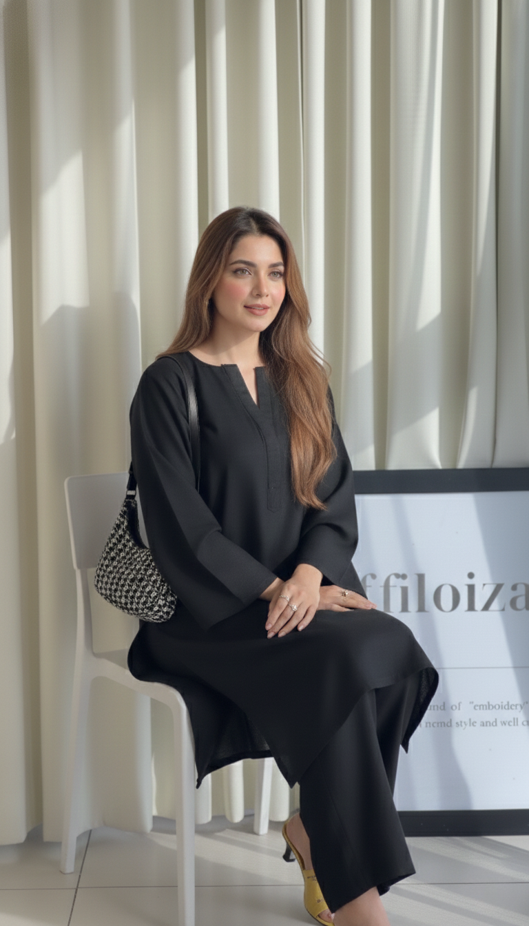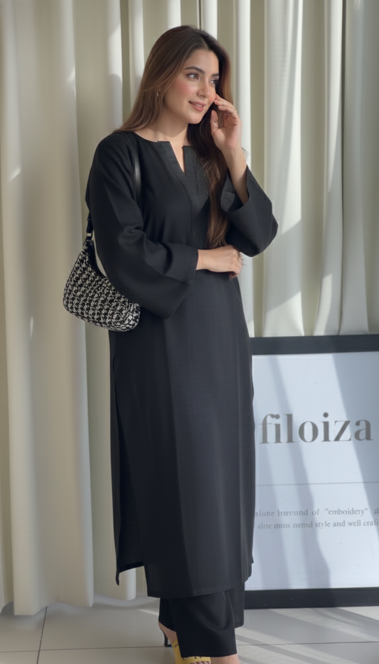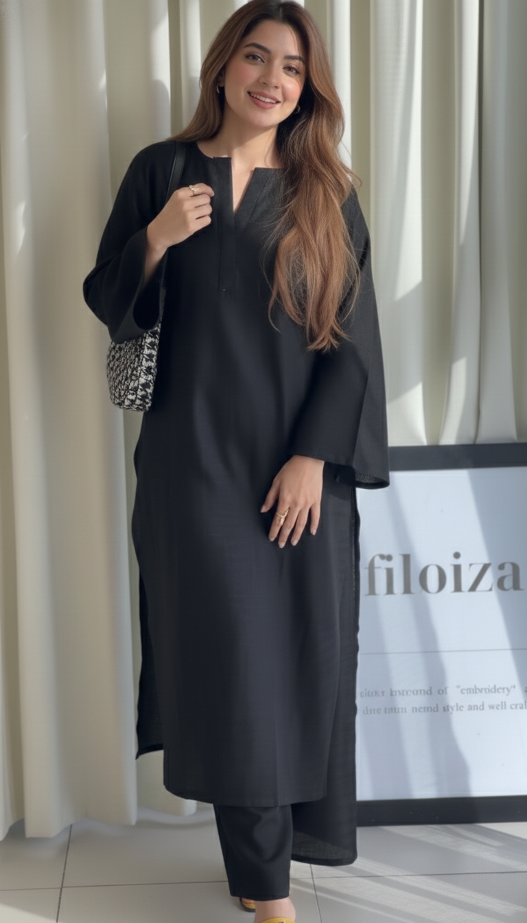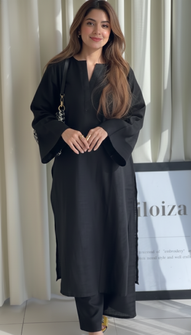 Crafted from 100% premium, breathable cotton, the set offers a sharp, tailored fit and comfortable wear. The long, straight-cut kurta features a simple V-notch neck and elegant, wide/flared sleeves, adding a chic, modern architectural detail to the silhouette.