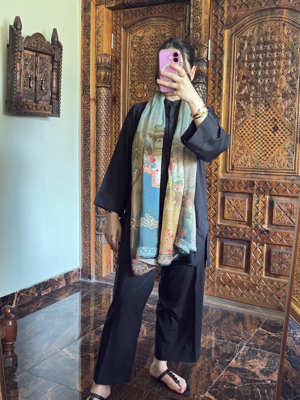 The Zaha Co-ord Set by Suidoora brings together modern tailoring with pure comfort. Crafted in premium 100% cotton, the set features a clean, mandarin-collared kurta with a concealed placket and straight-fit wide-leg pants — all in classic black.